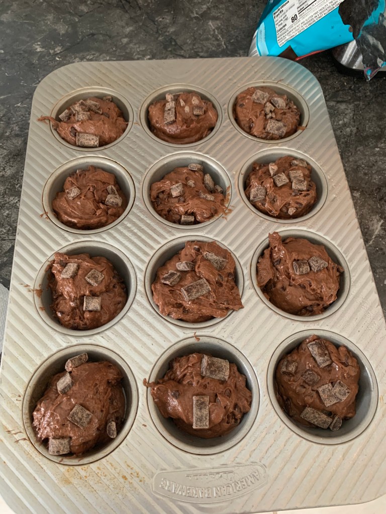 3. Scoop 1/3 cup of batter into lined or lightly oiled muffin tins. Top the batter with mega chunk chocolate chips, as desired.