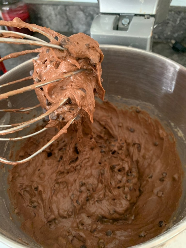 2. Mix dry ingredients #1-7 in kitchen aid, add in butter, and then add the remaining ingredients #9-13. Batter should be very sticky and scoop-able like this: