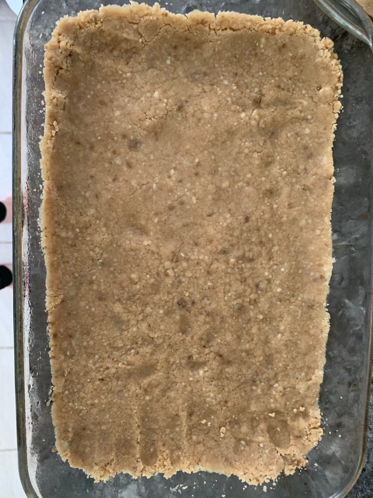 6. Take the crust out of the oven and spread sweetened condensed oat milk on it.