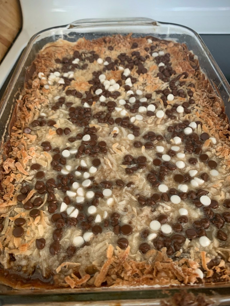 7. Sprinkle coconut flakes (if you can have coconut), white chocolate chips, and dark chocolate chips on top.